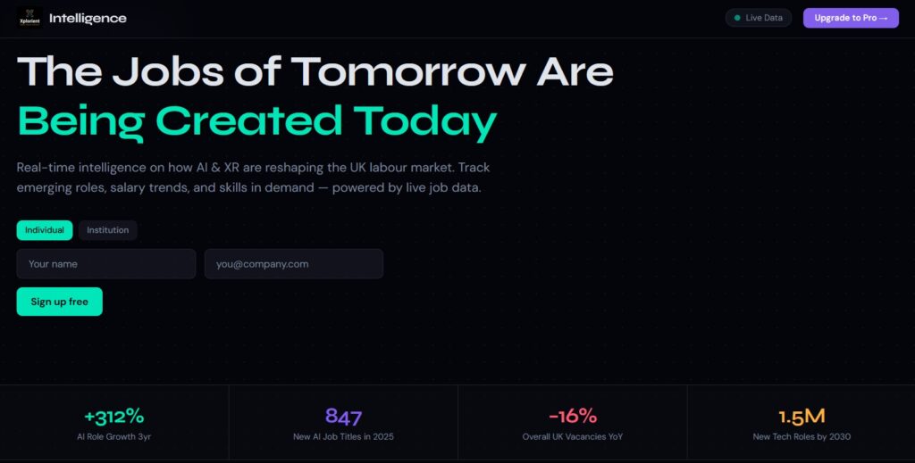 Alongside this, I am the founder of Xplorient, where I am building three products: a UK Career Intelligence platform, an XR-powered Career Studio and an XR Work Marketplace.